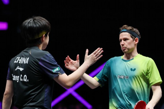 3月11日,王楚钦(左)和格罗特在比赛结束后相互致意。新华社记者 黄伟 摄
