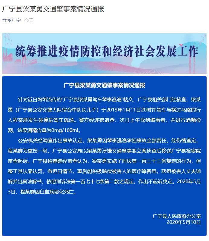 荔枝新闻讯 据广东肇庆市广宁县人民政府办公室消息称,针对近日网络流传的“广宁县梁某勇驾车肇事逃逸”帖文,广宁县相关部门经核查,梁某勇(广宁县公安交警大队综合中队长儿子)于2019年1月11日20时许驾车与横过马路的行人程某群发生碰撞后驾车逃逸。警方经连夜追查,次日上午找到肇事者,并进行酒精检测,结果酒精含量为0mg/100ml。