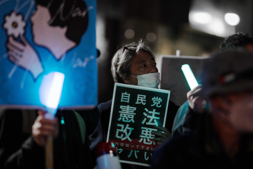 4月8日晚,大批日本民众在位于东京的国会议事堂前集会,抗议高市早苗政府部署远程导弹、企图解禁杀伤性武器出口等破坏和平宪法的动向,在集会现场,抗议者手持写有“守护宪法第九条”“不要战争”“高市政权即刻下台”等字样的标语,高喊“反对修宪”“反对战争”等口号,呼吁维护和平宪法 图:新华社